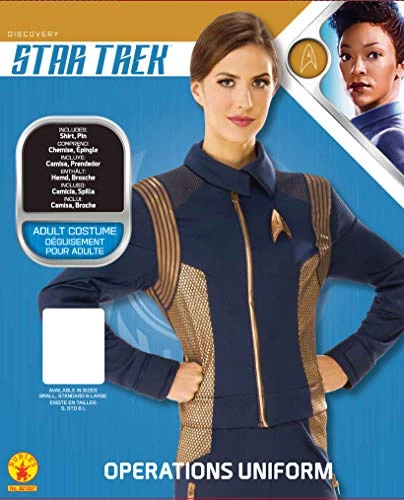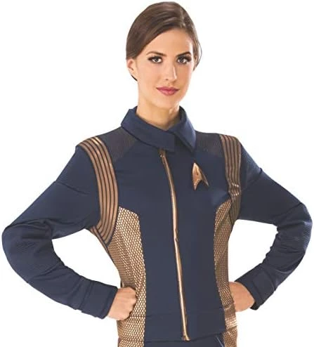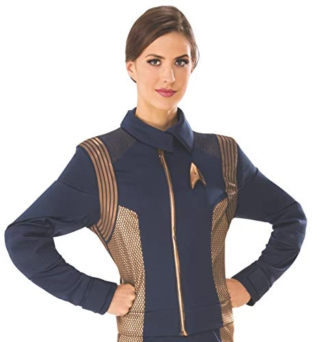 Join the Fleet Ops and help your crew aboard the USS Discovery on the mission to seek out new civilizations, new life and go boldly where no man (or woman) has gone before in this officially licensed Star Trek Discovery Women’s Operations uniform jacket. Deluxe long sleeve navy blue costume jacket with collared neckline; quilted elbows; bronze striped sleeve accents; bronze printed Starfleet insignia; removable plastic communicator pin and zipper closure in front. Pair with the rest of your crew and search for Commander and Science officially licensed Star Trek Discovery costumes by Rubie’s to create a whole crew ready for exploration and fun! Includes jacket only; all other pieces shown sold separately. Designed to be worn with your own bottoms. Star Trek Discovery is based 10 years before the original Captain Kirk’s five year exploration took place and follows the USS Discovery and it’s crew on their mission to discover new civilizations on new worlds in space. Pair with other officially licensed Star Trek costumes by Rubie’s for a whole crew look ready for deep space. Family-owned, family-focused, and based in New York since 1950. As the world’s largest designer and manufacturer of costumes Rubie’s brings fun and fantasy to dress-up. Offering everything from full mascot suits to masks and wigs, from deluxe licensed costumes to simple starter pieces, from costume shoes to character make-up, and so much more. Rubie’s promotes safety in dress-up, so you can relax and have a great time while looking the part. Look to Rubie’s for every costume occasion and season: Halloween, Christmas, Mardi Gras, Easter, and all occasions in-between.