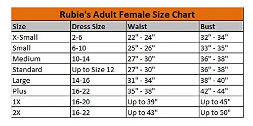 - READ BEFORE BUYING: Costumes are not sized the same as apparel, please review the Rubie’s FEMALE SIZE CHART IN IMAGES, reviews and Q & A for best fit, do not choose based on clothing size
